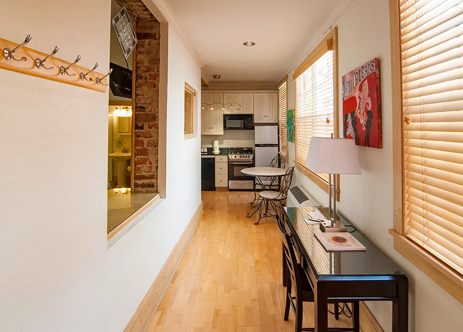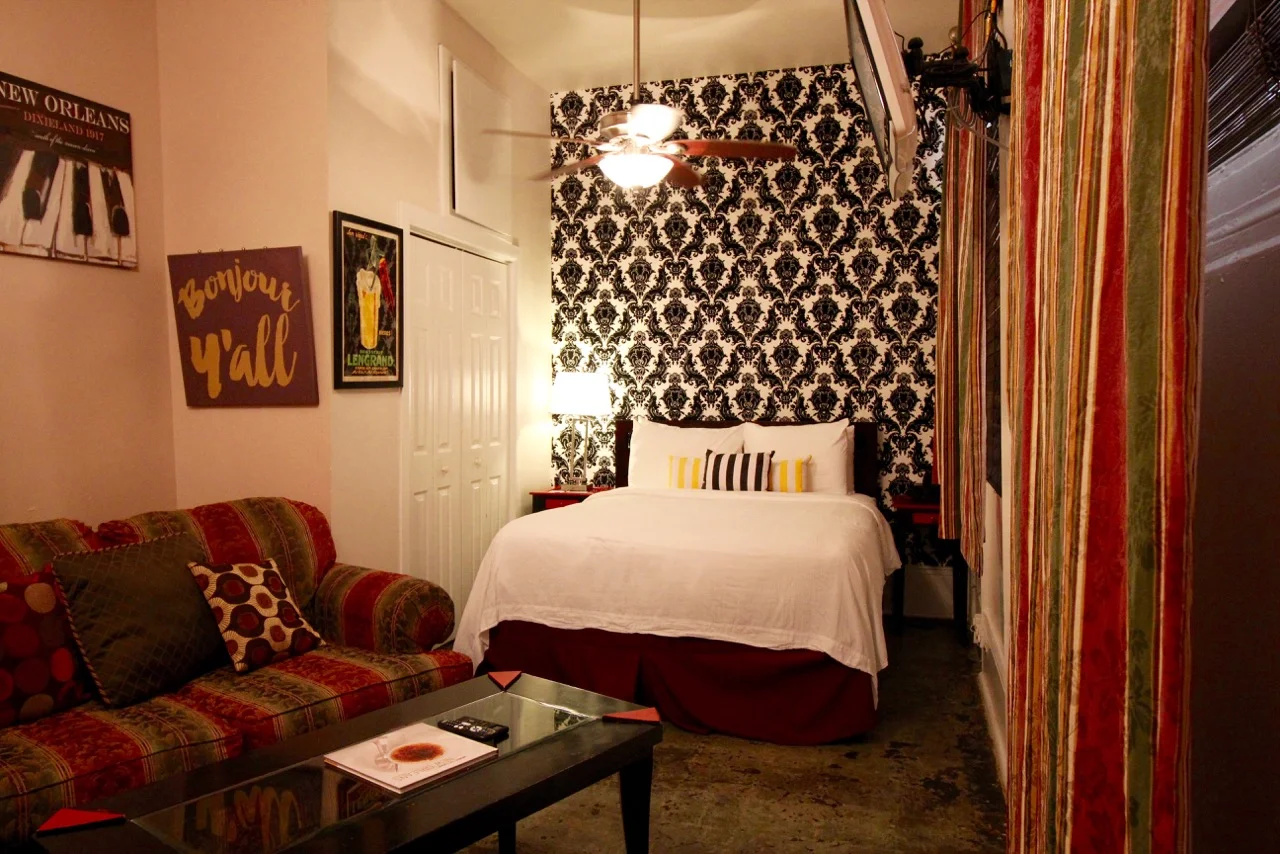 Our 2 bedroom suites consist of 2 queen beds each in their own bedroom, one full bathroom, a kitchenette, sitting room, and a great view through the window of the NOLA skyline.
